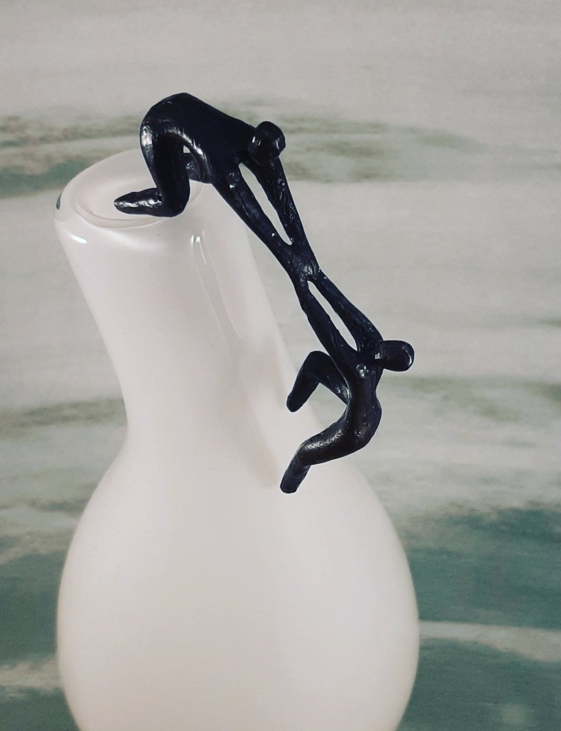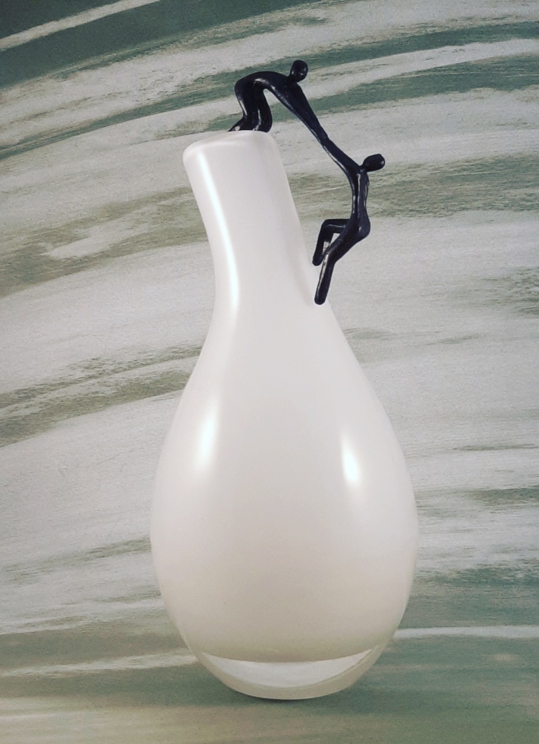 | Materiaal: | Verbronsd op wit, niet transparant glanzend vaasje van glas. |